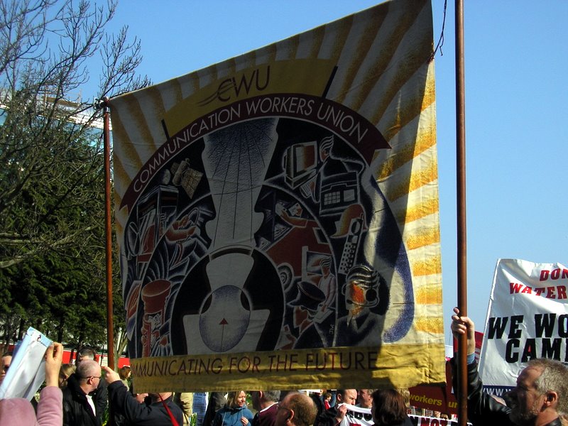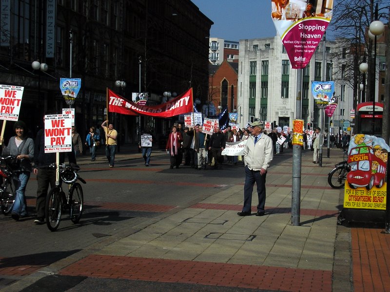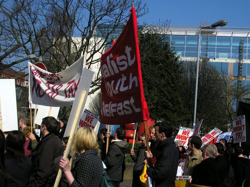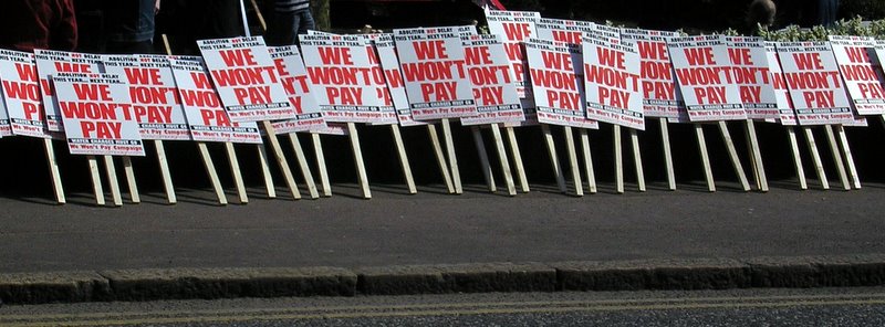 Good photo with union banners and We Won't Pay placards prominently displayed