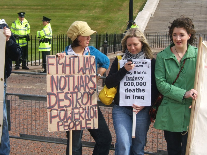Peace activists had pledged to use Mr Blair’s presence at the Stormont Assembly to protest against the conflict in Iraq.