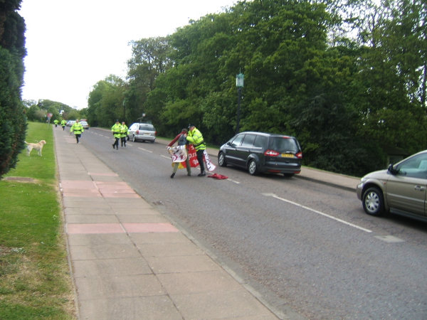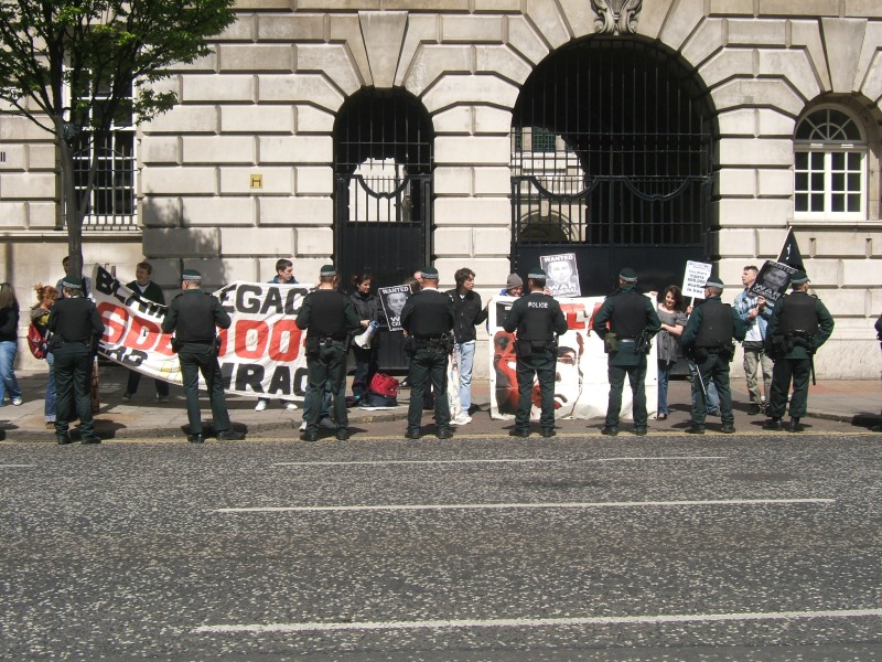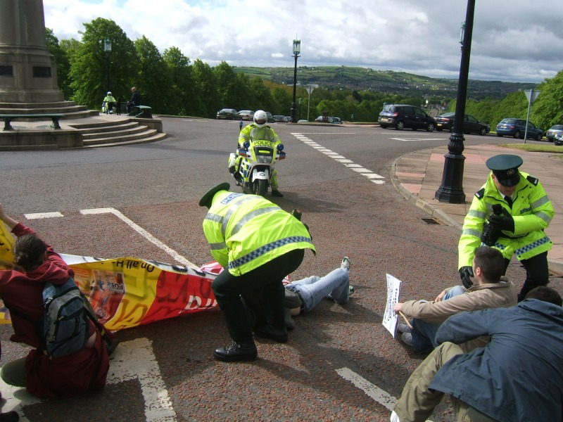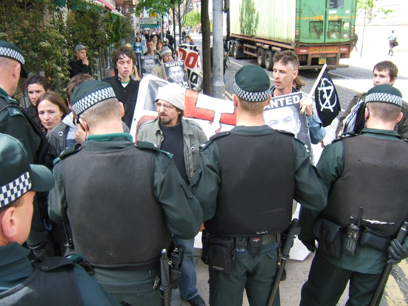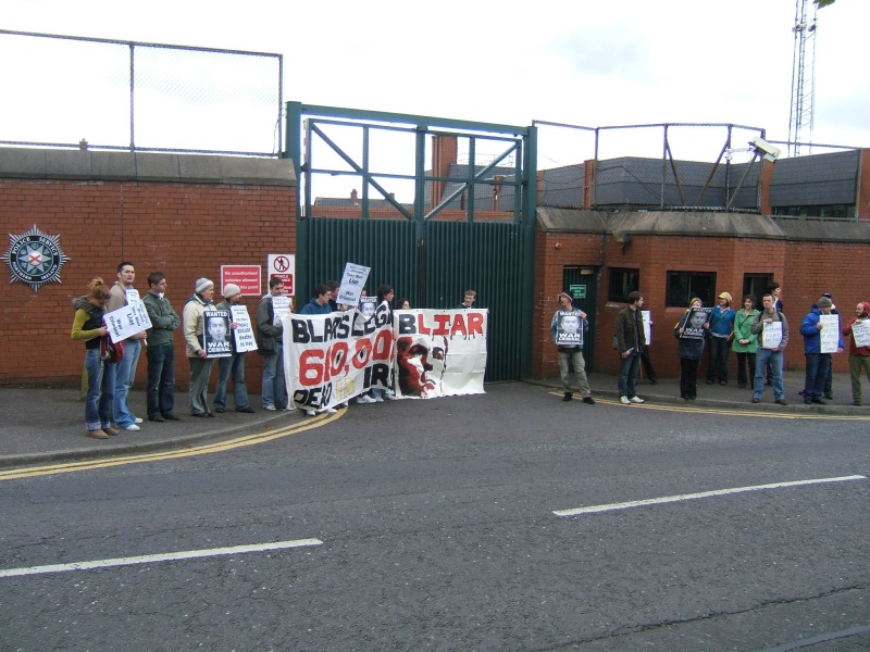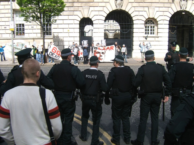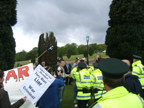 The anti-war protestors returned to Belfast city centre where they discovered that a heavy police presence was awaiting the arrival of Blair behind the City Hall in the offices of the Belfast Newsletter. The cops quickly formed a line around the protestors to hem them in and prevent them getting too close to the war criminal. Another protestor was arrested a few minutes after these photos were taken.