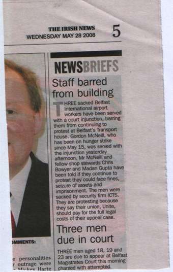 by The Digger Mon May 19, 2008 12:11 ![]() The Digger notes that according to latest inside reports, Unite has reportedly now told the protesters that no further talks will be held with them until they publicly verify all the monies that have been paid to each individual from the union coffers! by f Mon May 19, 2008 15:19 ![]() Gordon McNeill has just been taken to hospital. further details to follow by x Mon May 19, 2008 19:29 ![]() Ricky Tomlinson speaks out in "full support" of the hunger strikers by martina Tue May 20, 2008 01:25 ![]() I'm reading comments here that are trying to portray that Jimmy Kelly is some kind of innocent in this situation. by Socialist Party Tue May 20, 2008 10:44 ![]() "What will it take for the Unite leadership to deal fairly with Gordon NcNeill and the Belfast Airport Workers. by Support Belfast Airport Workers Thu May 22, 2008 10:57 ![]() Rally to support the Belfast Airport Workers by f Thu May 22, 2008 12:47 ![]() Tomorrow's rally will be postponed to allow time for the union to sort this out by f Fri May 23, 2008 10:50 ![]() Legal bills understood to be paid – Unite promise to make compensation offer by G - none Fri May 23, 2008 12:41 ![]() This is just nonsense- the legal bills were paid- as far as i was aware- and that is only right but the compensation? Rubbish. by Supporter Fri May 23, 2008 14:36 ![]() G - None - it is your comment that is nonsense - the legal bills had not been paid, read the workers statement, stop attempting to spread lies. by impartial observer - ordinary member of UNITE Sat May 24, 2008 01:32 ![]() The lads are on a hunger strike for a £1million each compensation. That's our union dues. I don't deny the guys were done down by a rightwing dog, but they are way over the top with their compensation claim. Our union has paid their legal fees, that was never in doubt. This hunger strike is an awful carry on. These guys may have support on this site, but not within the union. by Stephen Boyd - Socialist Party Sat May 24, 2008 12:09 ![]() You are far from an impartial observer. I doubt that you are even an ordinary Unite member as you claim. Your brief post is an insult to the Belfast Airport Workers, and its few sentences contain deliberate lies and slander. by Stephen Boyd - Socialist Party Sat May 24, 2008 12:12 ![]() For the latest information go to by Interested Tue May 27, 2008 16:13 ![]() http://www.wsm.ie/news_viewer/3953 by f Tue May 27, 2008 22:41 ![]() "Unite are trying to deny us our democratic right to peacefully protest." Gordon McNeill by curious - none Wed May 28, 2008 08:38 ![]() I see that as well on http://www.wsm.ie/news_viewer/3953 by f Wed May 28, 2008 09:33 ![]() PRESS RELEASE - Tuesday 27th May by f Wed May 28, 2008 10:13 ![]() Irish News Text by f Wed May 28, 2008 11:39 ![]() The letter that Tony Woodley chose to ignore by confused Wed May 28, 2008 18:53 ![]() An earlier statement from Gordon McNeill says they have been. Can someone put up a SHORT explanation of why the hunger strike continues.. by Socialist Wed May 28, 2008 19:02 ![]() Dear Confused Jimmy Kelly has called the cops again to arrest the Airport Workers, why don't you phone him up about that! by bigjimlarkin - unite Wed May 28, 2008 19:04 lisbon67 at hotmail dot com ![]() Transport House Sacked airport workers accuse Unite leadership of issuing "black propaganda and disinformation" to t