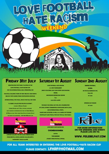 A 'Love Football Hate Racism' weekend is being organised as part of the Feile this year in West Belfast, from the 31st July - 2 August.